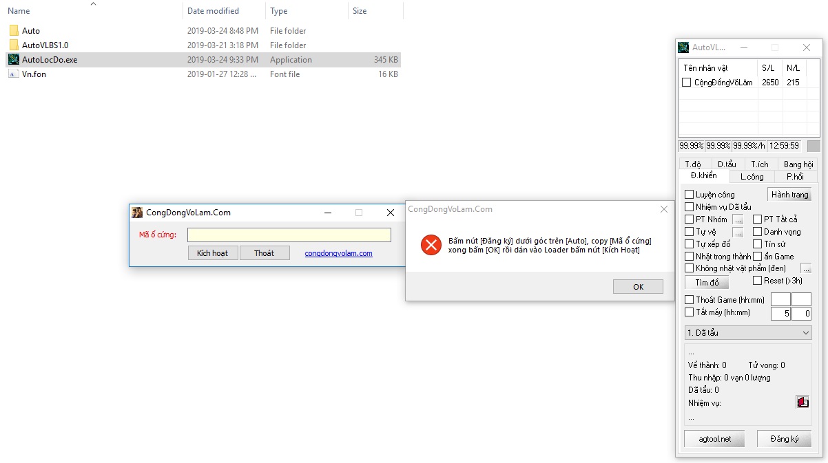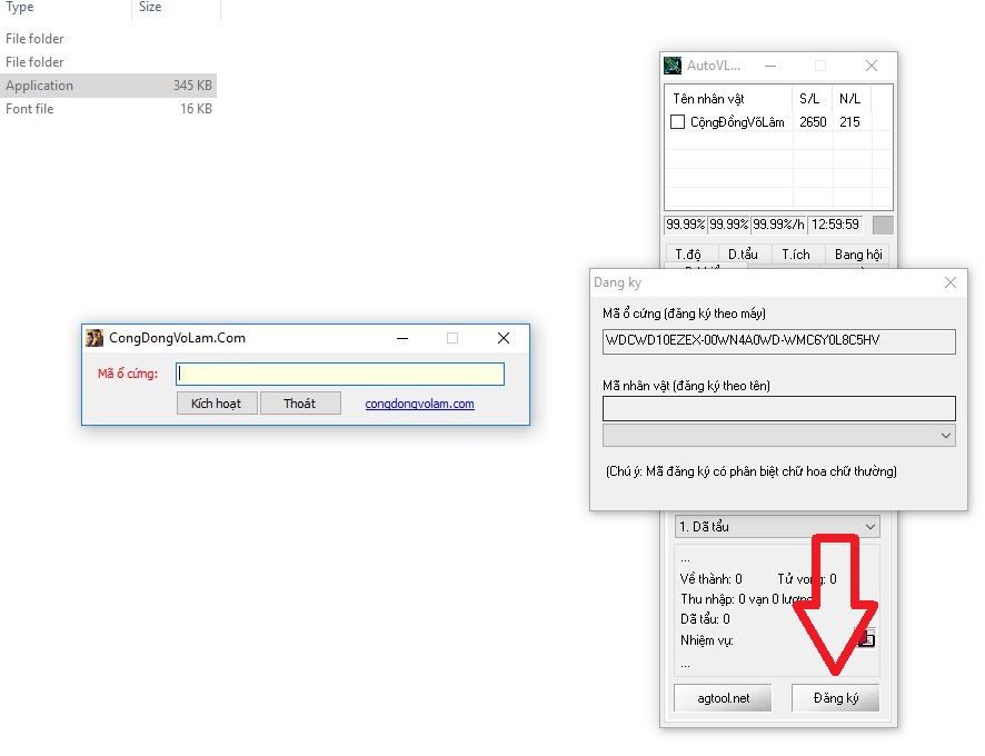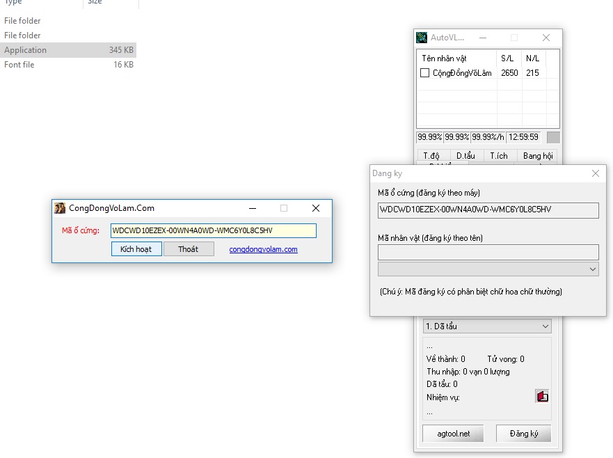 Bước 5: Copy mã ổ cứng ở auto Copy vào ô CongDongVoLam.Com(trái) bấm Kích Hoạt rồi chờ giây lát
