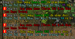 Người chơi được chọn món của từng môn phái (không random phái), hiện chỉ cho 1 món giống món mặc định để không chênh lệch sức mạnh nhiều. Admin lần đầu thử nghiệm tính năng event tống kim theo tháng cho server.